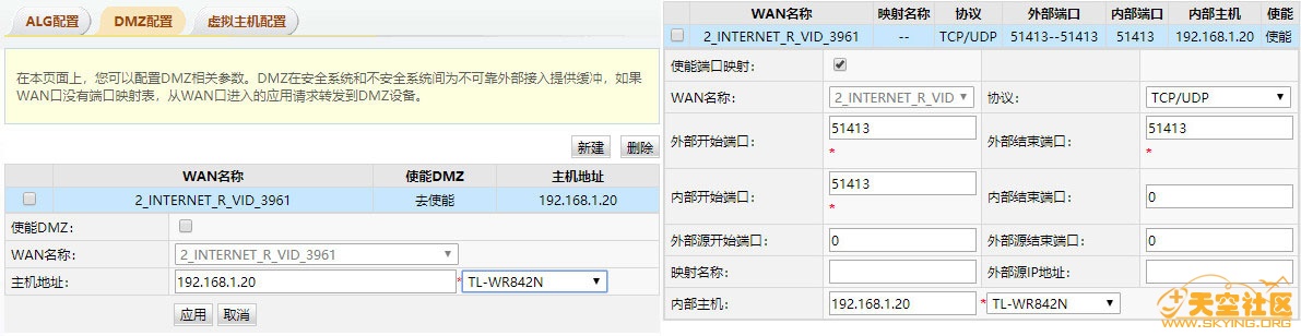 如果你的下載設(shè)備是在普通路由下面分出來(lái)的網(wǎng)線,你則需要在普通路由和光貓上面做雙向綁定,而因?yàn)槁?lián)通光貓默認(rèn)的WEB管理地址為192.168.1.1,所以登錄上去找到“DMZ設(shè)置”和“虛擬主機(jī)設(shè)置”按照上圖設(shè)置你的路由的IP地址,圖上的IP地址填寫你路由的IP,一般也都會(huì)顯示的。